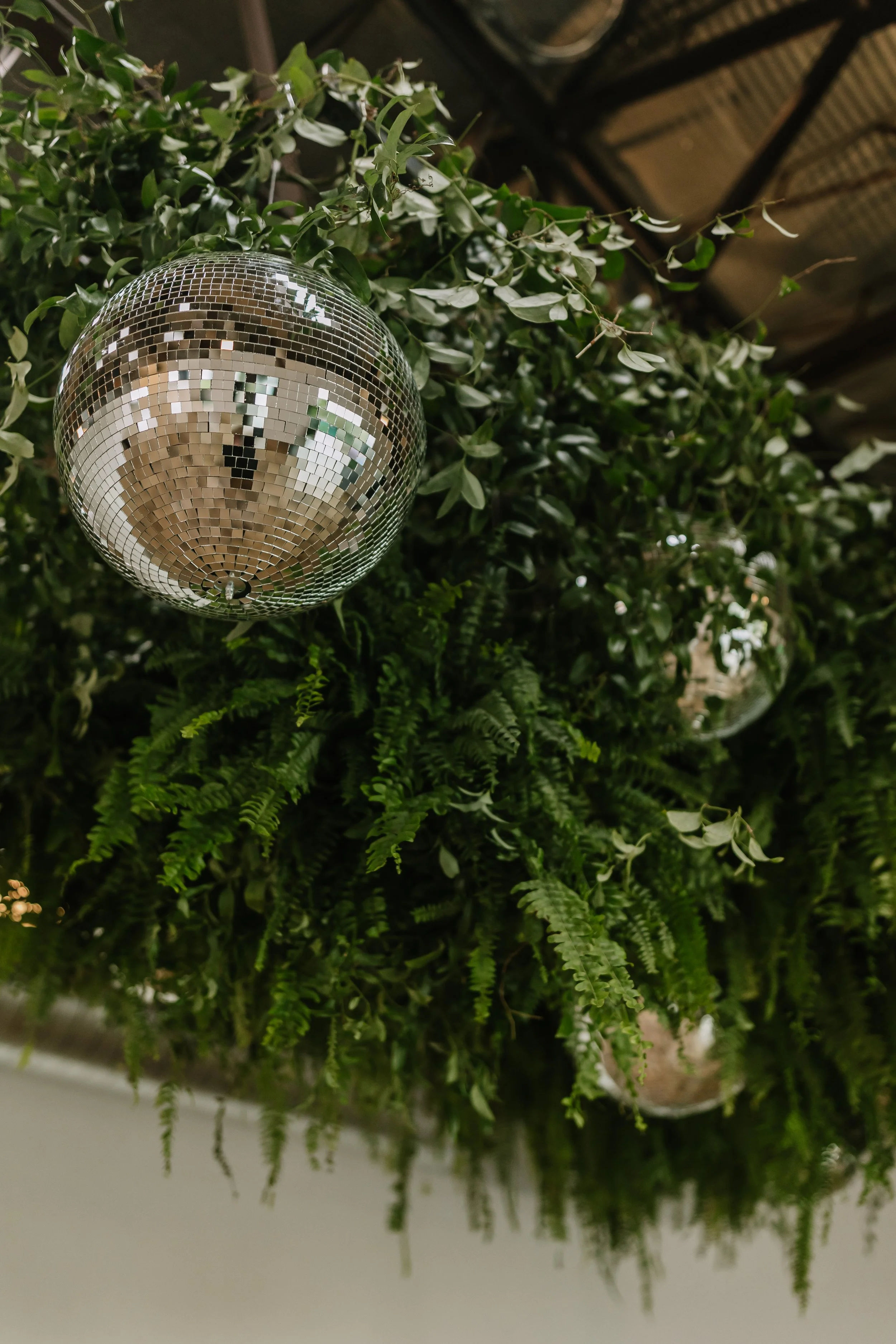 These large-scale hanging installations combine organic greenery with reflective disco elements, transforming industrial interiors into immersive, celebratory environments. Suspended from exposed trusses, each piece balances structural engineering with visual rhythm, merging natural forms with retro-inspired shimmer.