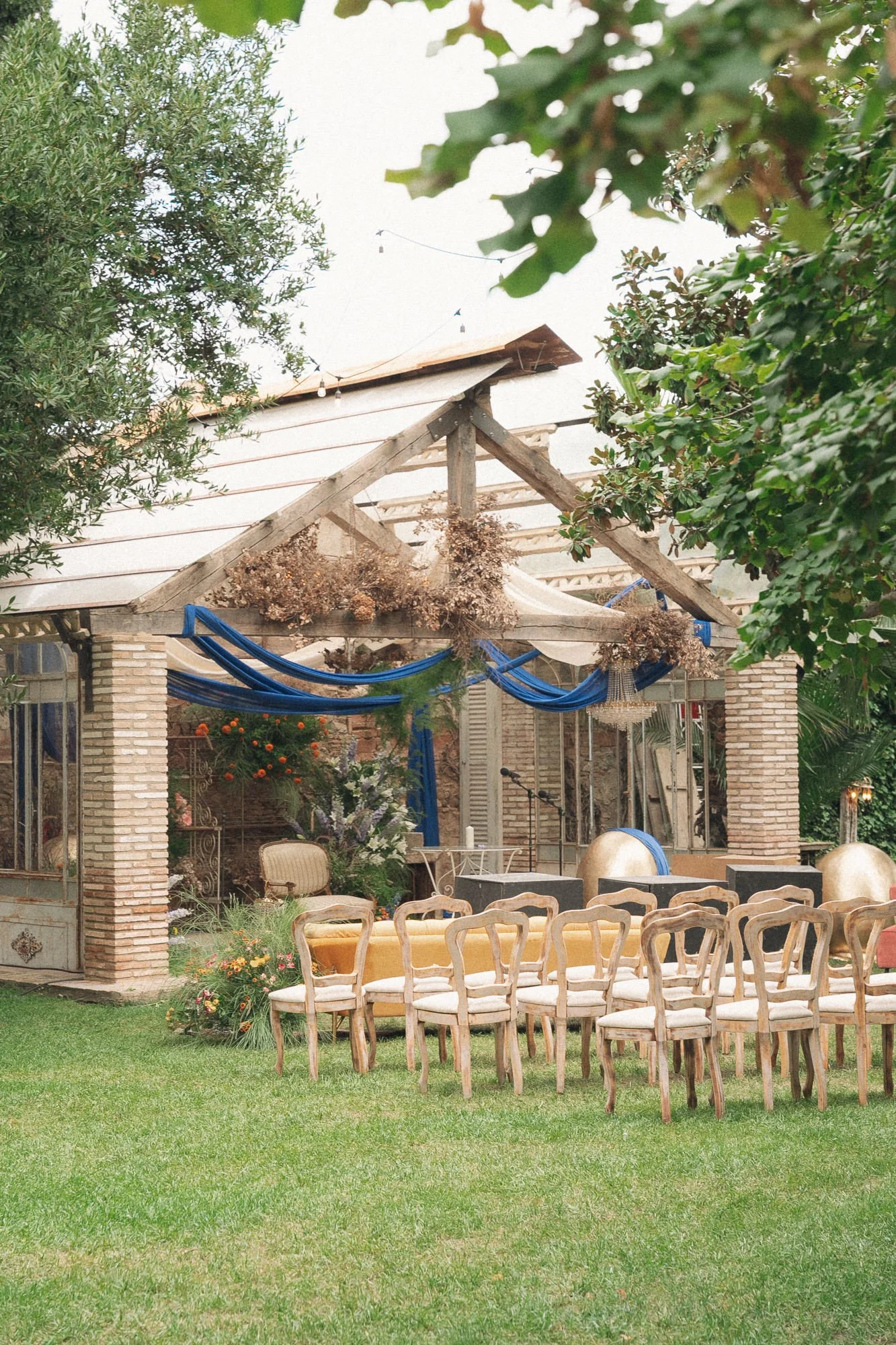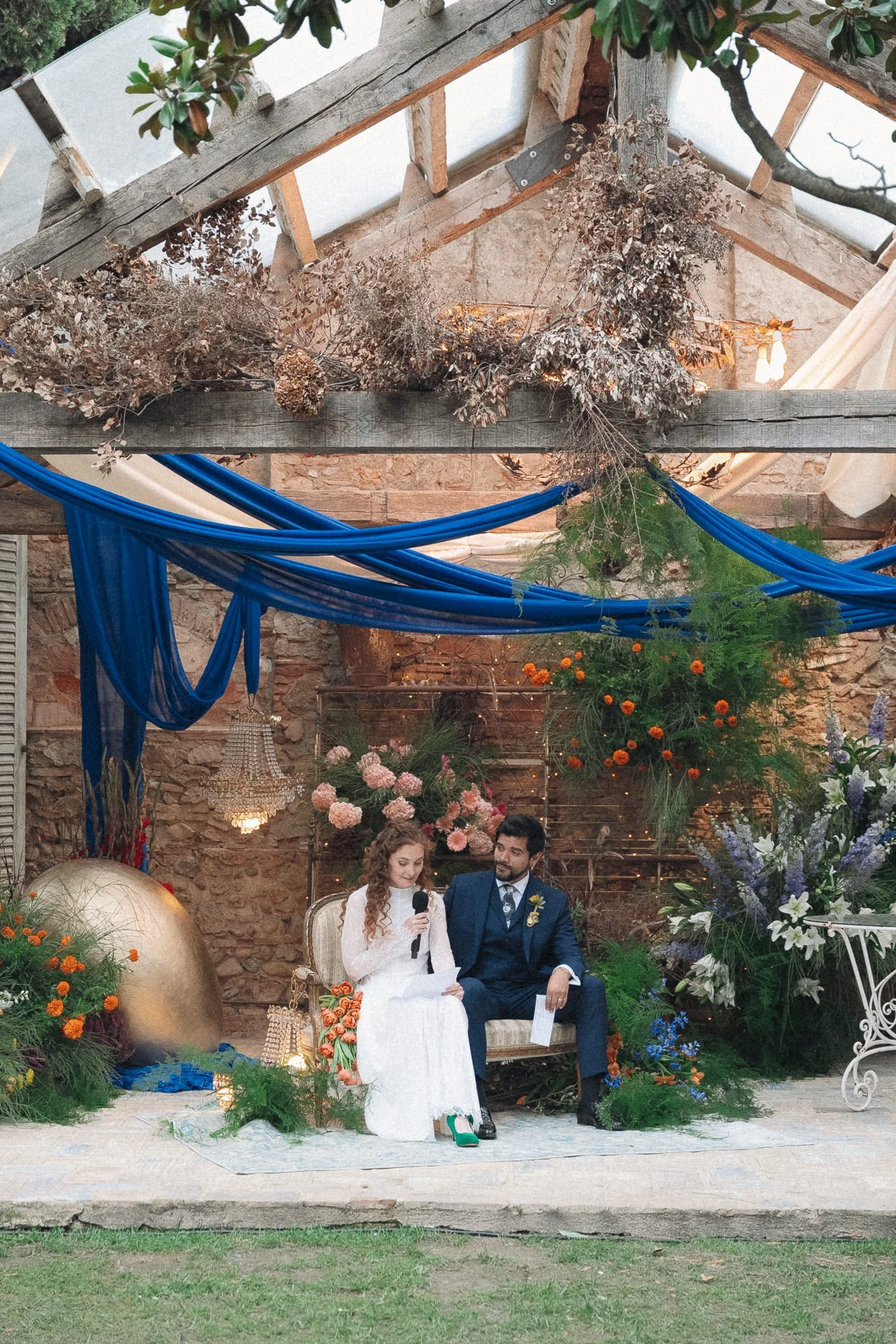 The eggs were then placed beneath a rustic wooden pavilion draped in deep cobalt blue and cream fabrics, colors chosen to echo Dalí’s palette of Mediterranean skies and divine absurdity. Surrounding the scene, we arranged wild florals — marigolds, lilies, and lavender — bursting from vintage ironwork and softened by delicate chandeliers and warm lights. The atmosphere became a living tableau: part dream, part memory, entirely Dalinian.