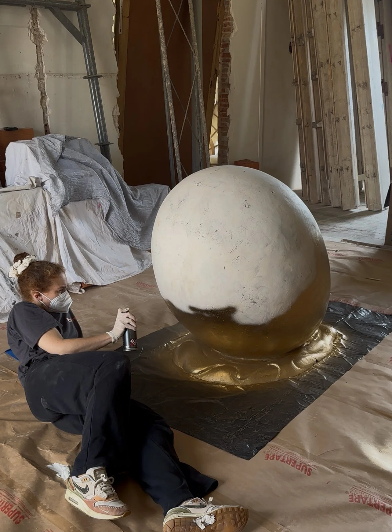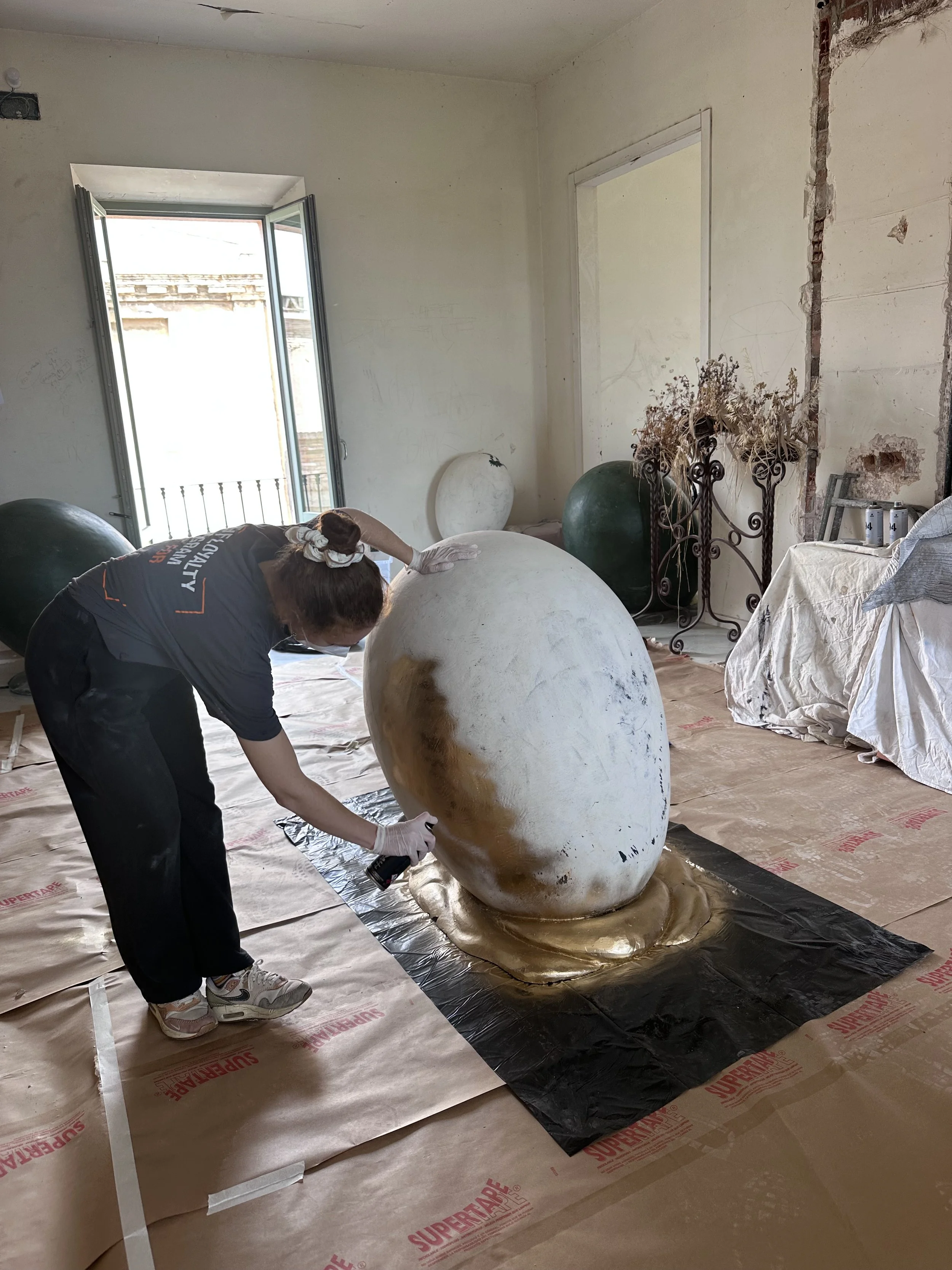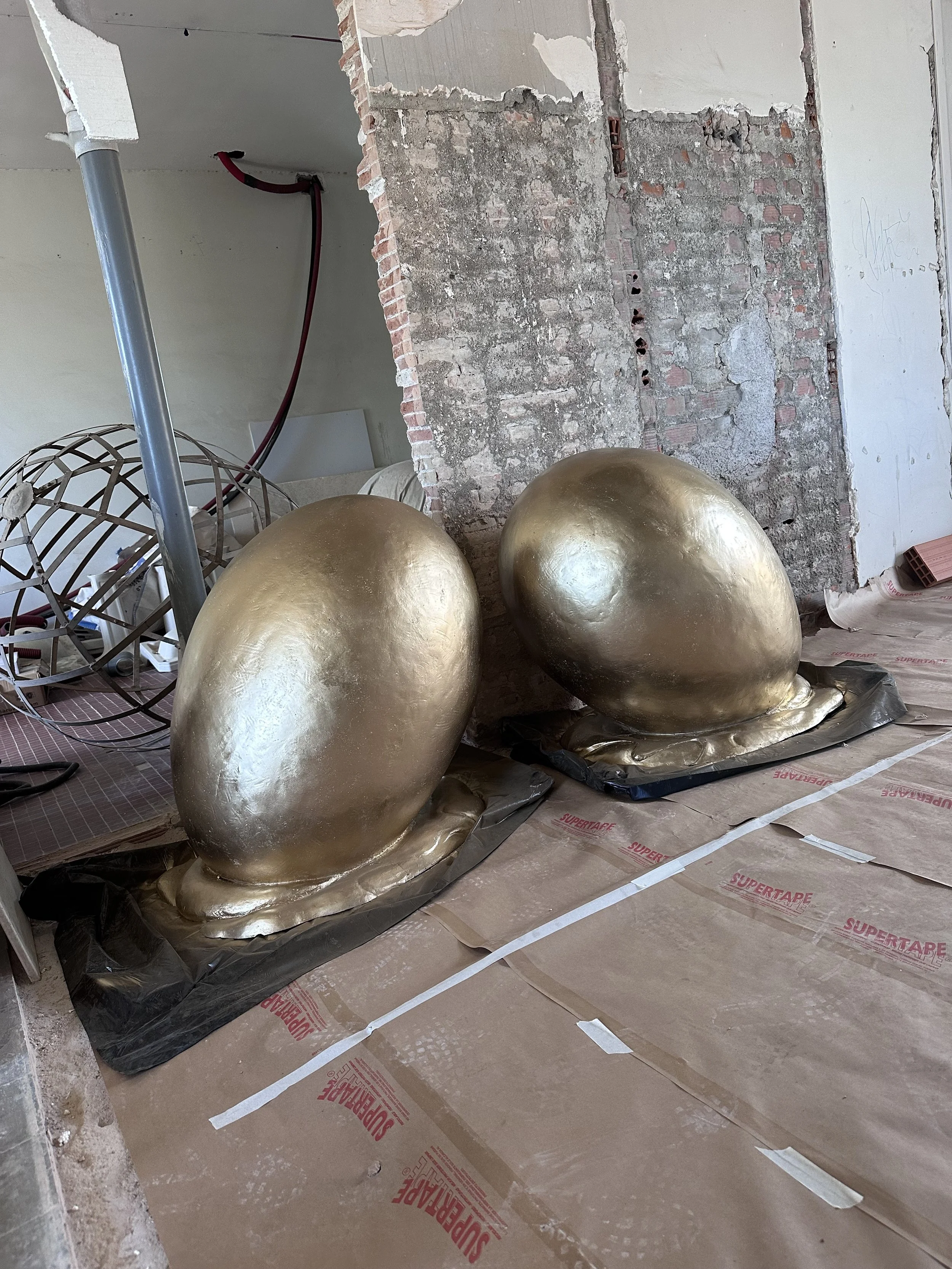 At the heart of the set stood two giant antique eggs, relics from a bygone décor collection, discovered weathered and forgotten. These eggs — a recurring motif in Dalí’s art, symbolizing birth, transformation, and creation — became our centerpiece. We carefully refurbished them: sanding away years of wear, repairing cracks, and restoring their sculptural presence. Then, in the studio, we coated each one in layers of metallic gold paint, applied by hand and spray to achieve a fluid, molten finish that captured the light like liquid surrealism.